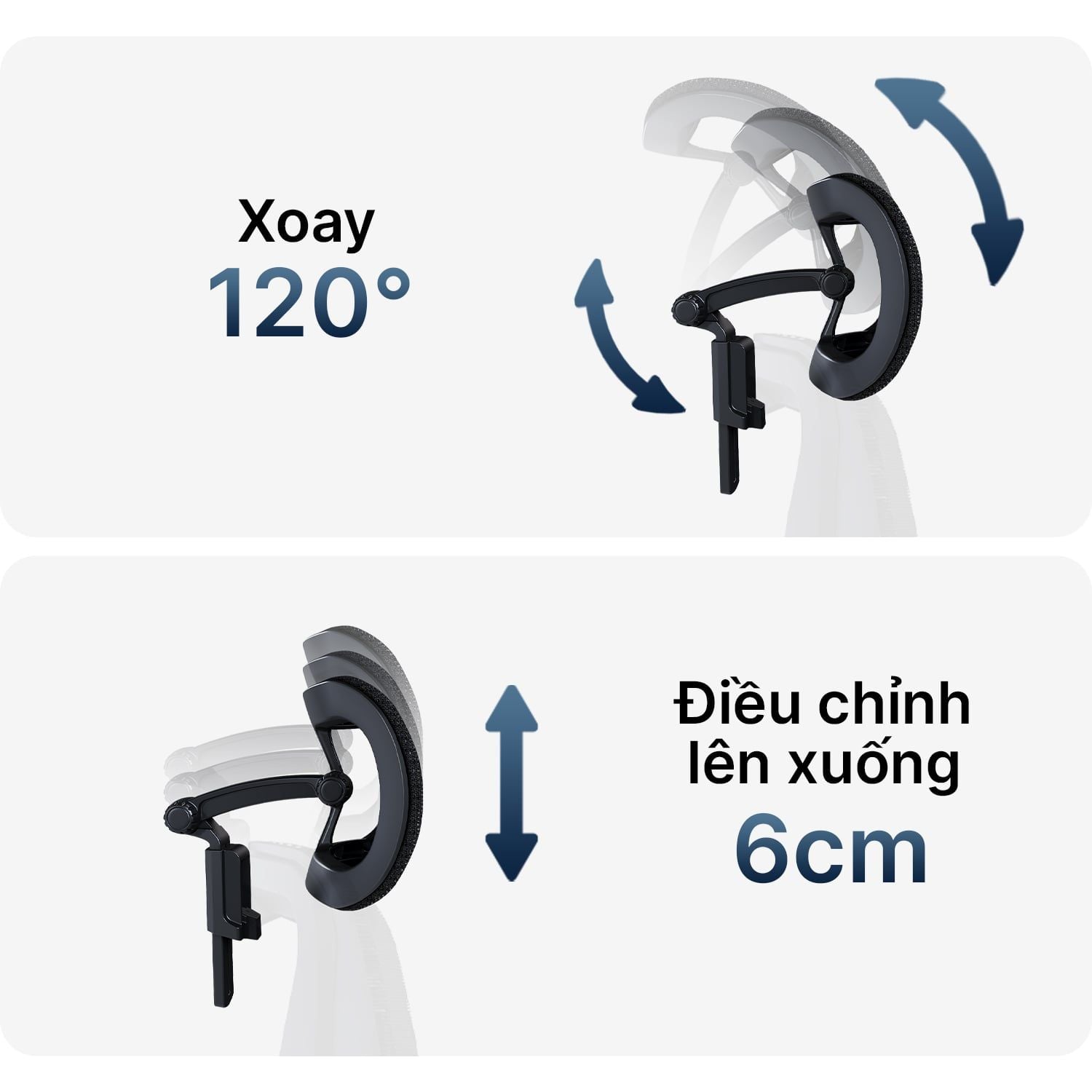 Tựa đầu điều chỉnh xoay góc 120°, nâng hạ trục 6cm