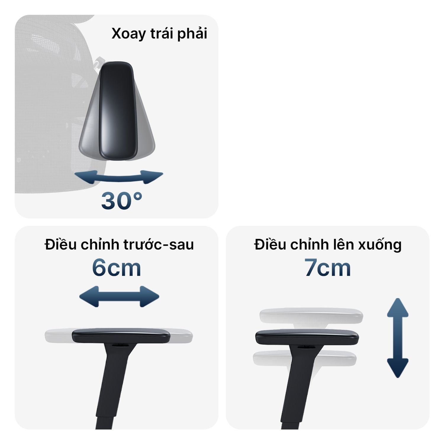 Tựa tay bọc PU mềm mại, tùy chỉnh 3D nâng hạ 7cm, tiến lùi 6cm, xoay góc trái phải